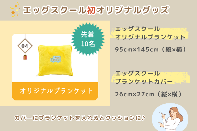 また、今回は先着10名様にエッグスクールのオリジナルブランケットのプレゼントもあります!