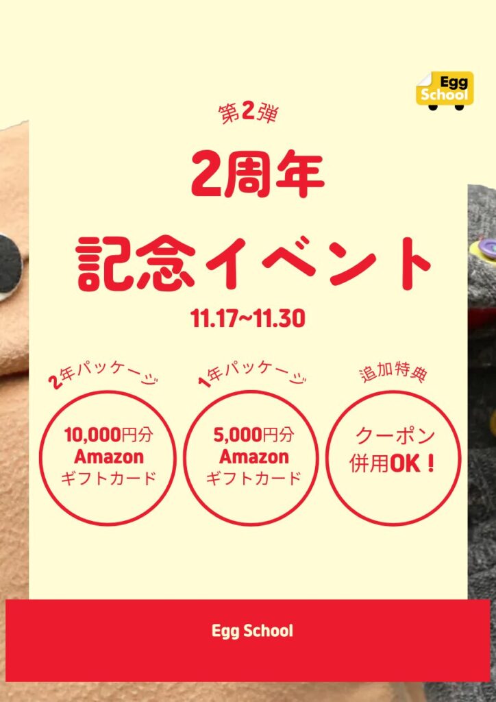 エッグスクールでは、11/17(月)〜11/30日(日)の期間限定でエッグスクール2周年記念イベント【第2弾】を実施中です。