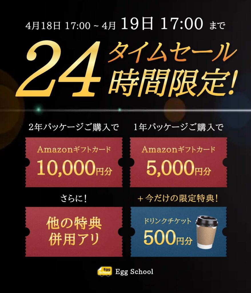 エッグスクールでは、4/18(土)17時~4/19(日)17時の24時間限定タイムセールが開催されます!