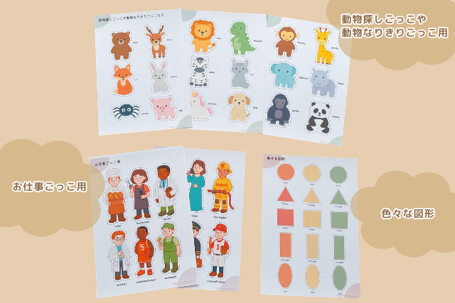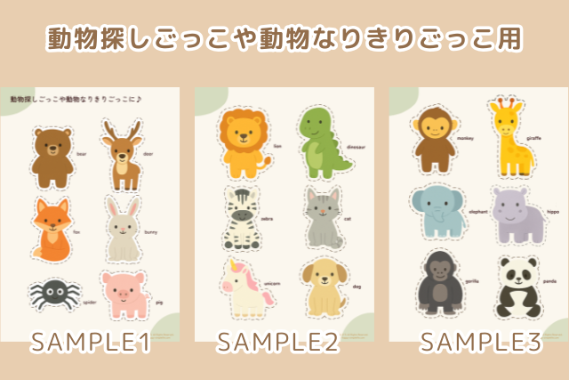 好きな動物を選んで、なりきりごっこ遊びをしたり、隠れた動物を探す遊びをしても楽しいですよ!