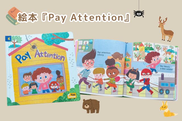 このエッグスクールのエピソードは、絵本『Pay Attention(集中してね)』とつながるお話で、“気が散る子どもたちと先生のやりとり”が面白く描かれています。