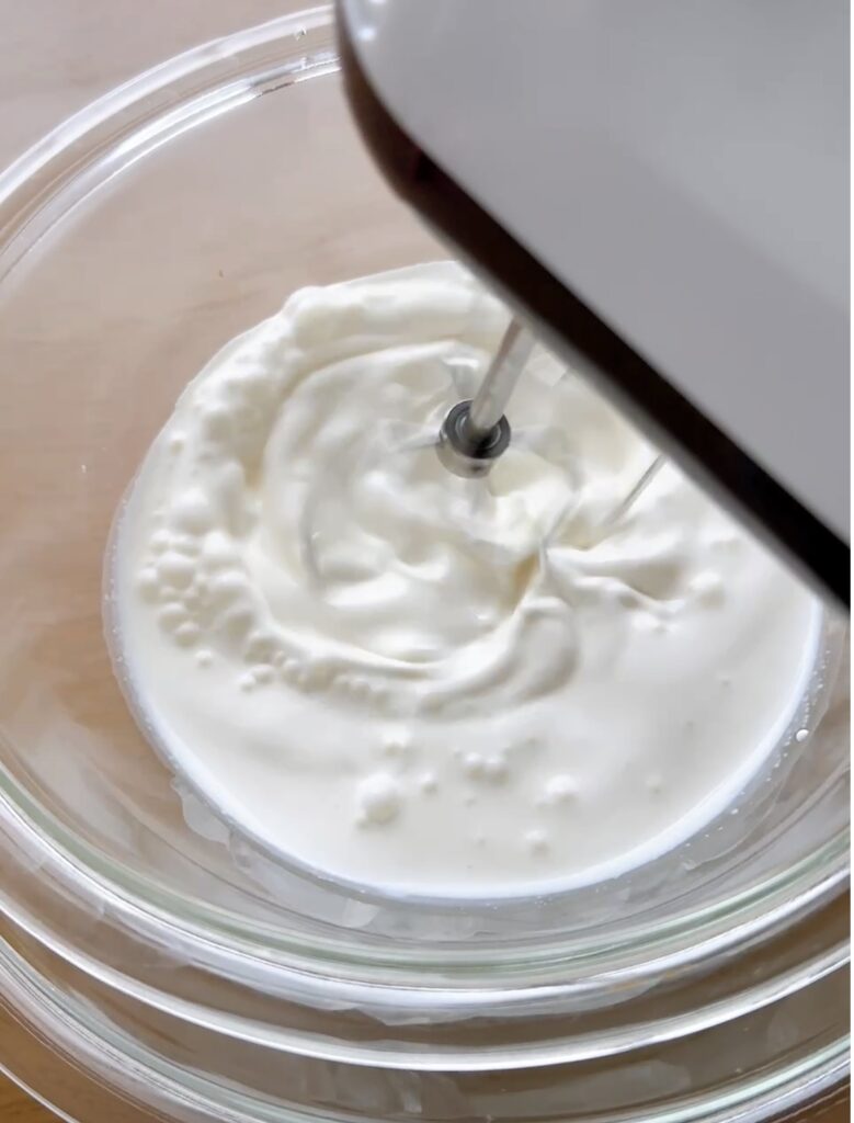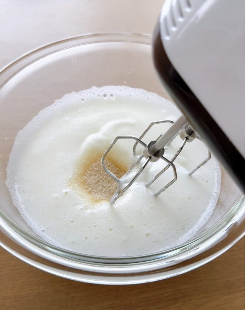 ①氷水を当てたボウルに生クリーム200ml、砂糖10gを加えて、ツノがピンッと立つまで泡立てる。