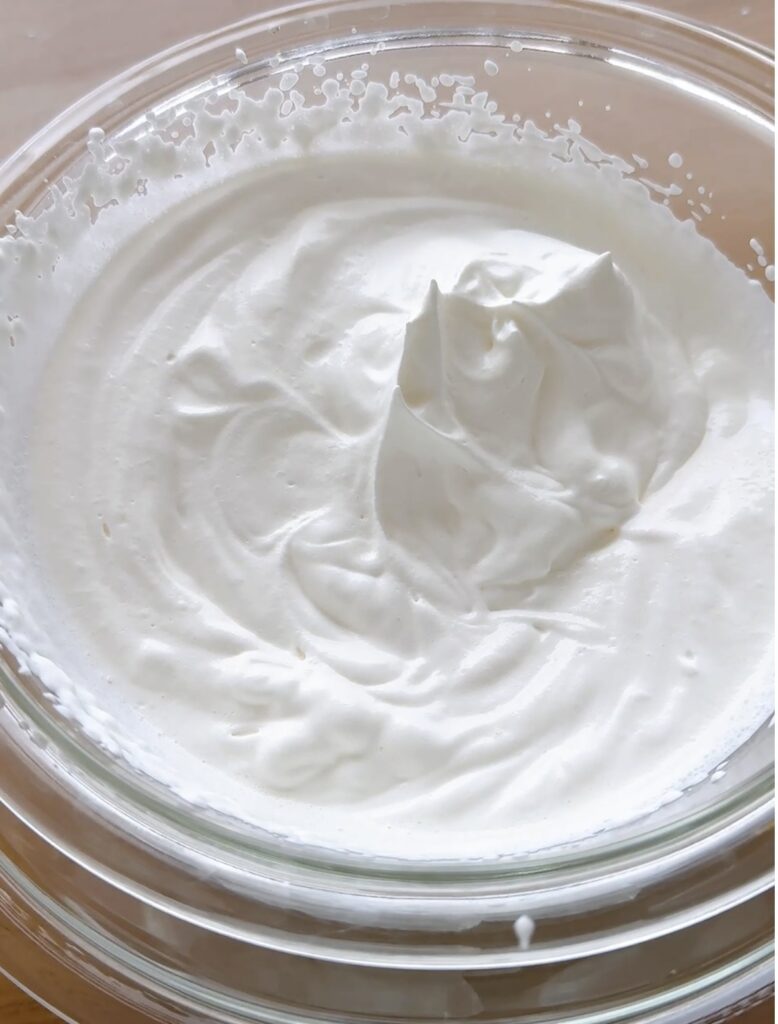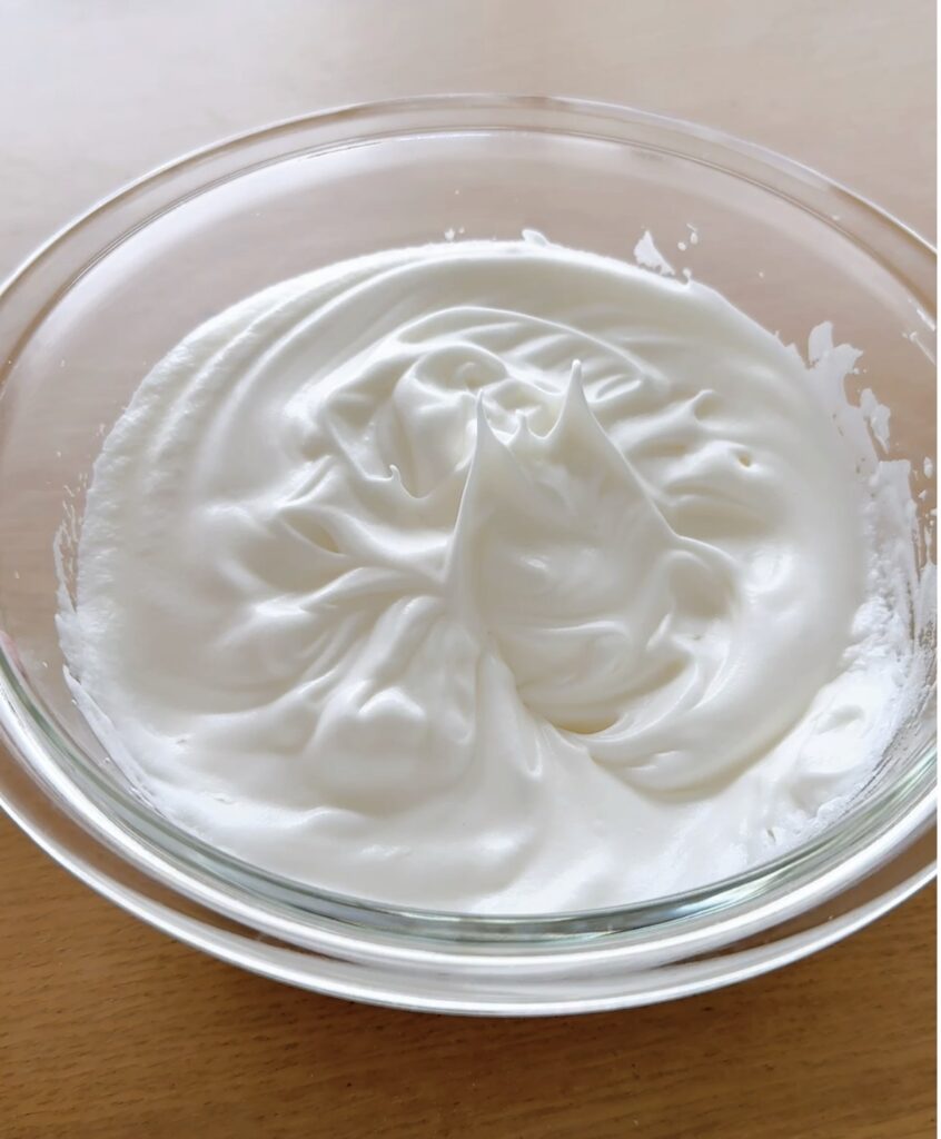 ⑥冷凍庫から冷やしておいた卵白のボウルを取り出し、空気を含ませるように泡立てる。