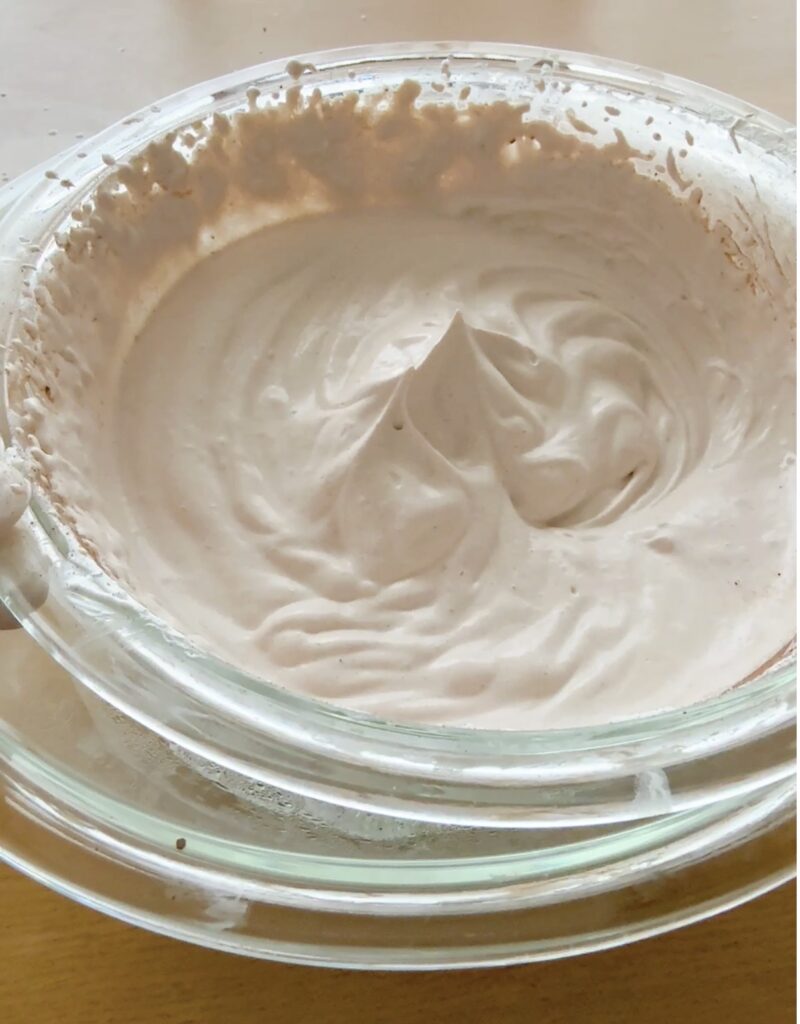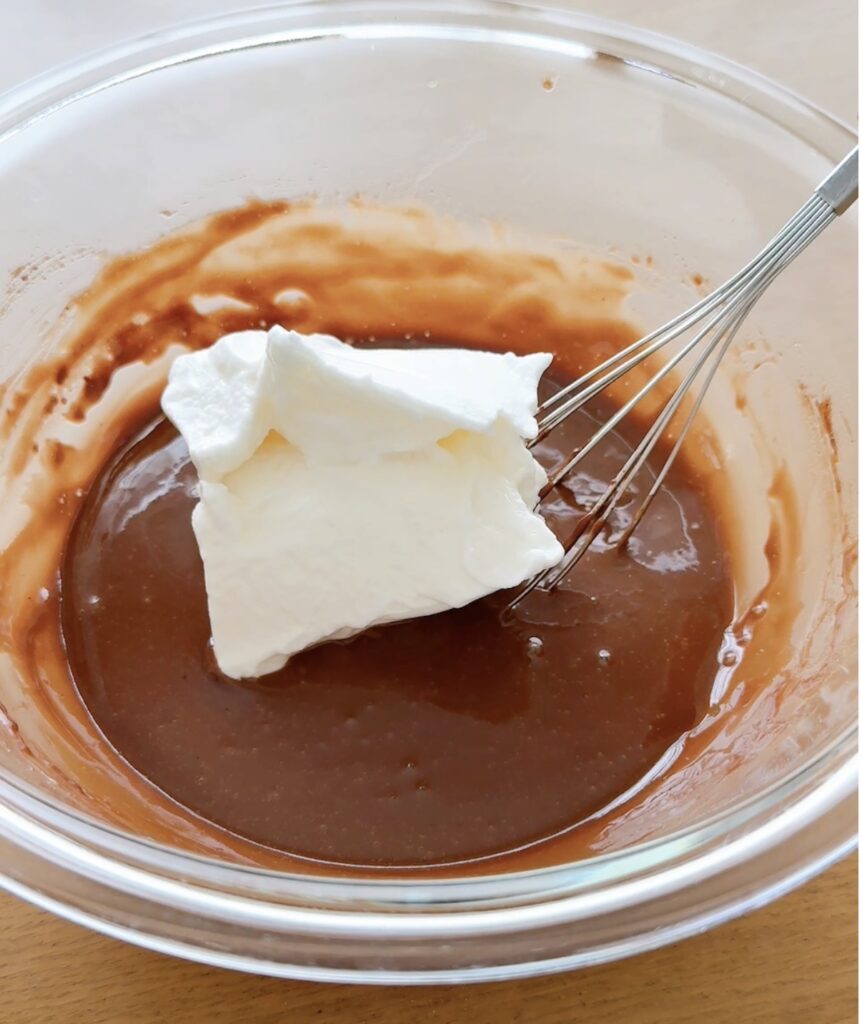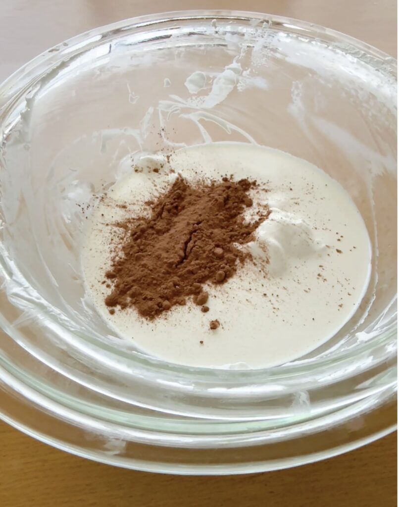 ⑦残りのクリームに、生クリーム200ml、砂糖10g、ココア10gを加えて、チョコクリームを作る。