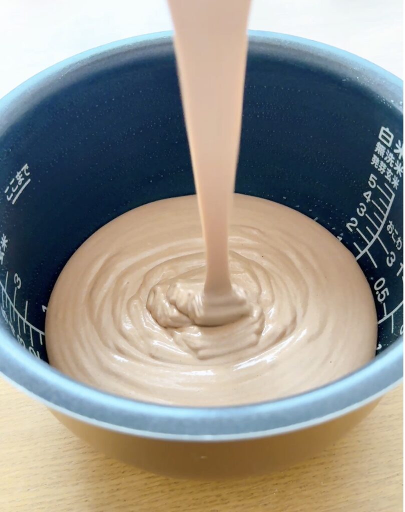 ⑩油(分量外)を塗った炊飯器に生地を流し込み、トントンと落として表面を滑らかにする。