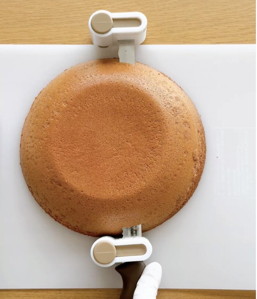 ②カットした下2枚のスポンジを重ねて並べる。