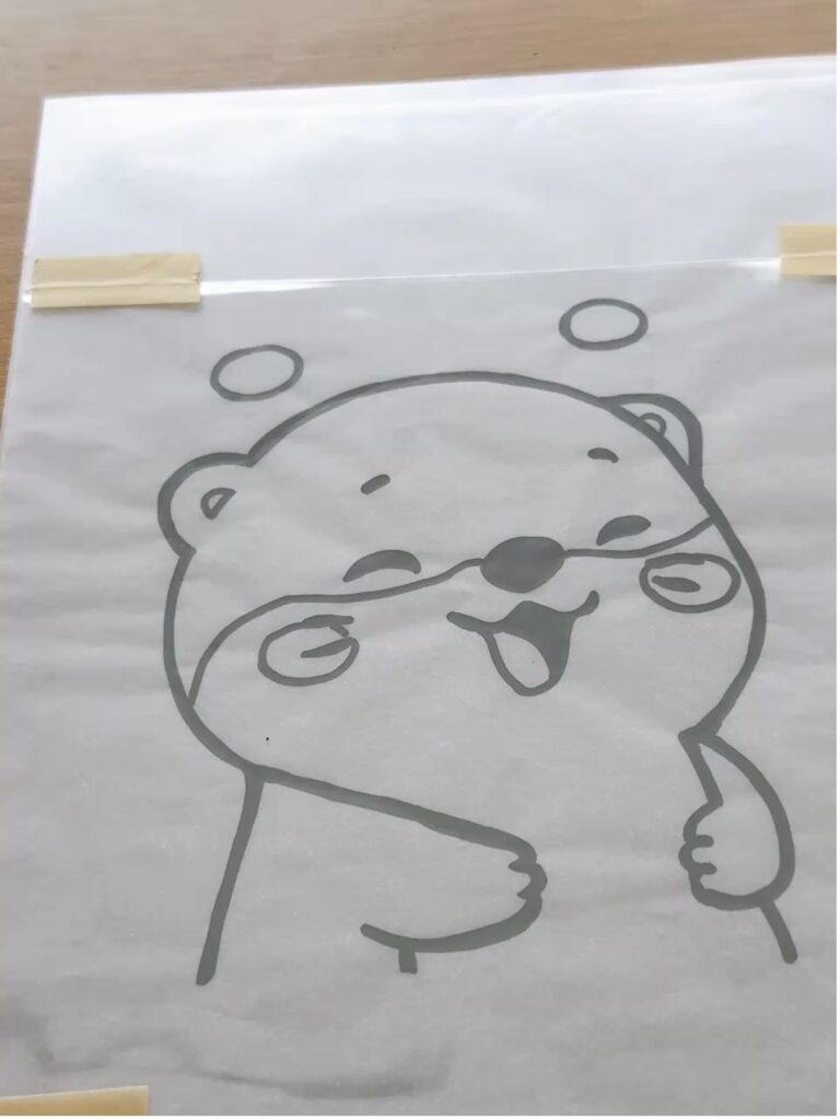 ①反転して印刷した絵をクリアファイルの間に挟む。その上に透明フィルムをのせて、マスキングテープで固定する。