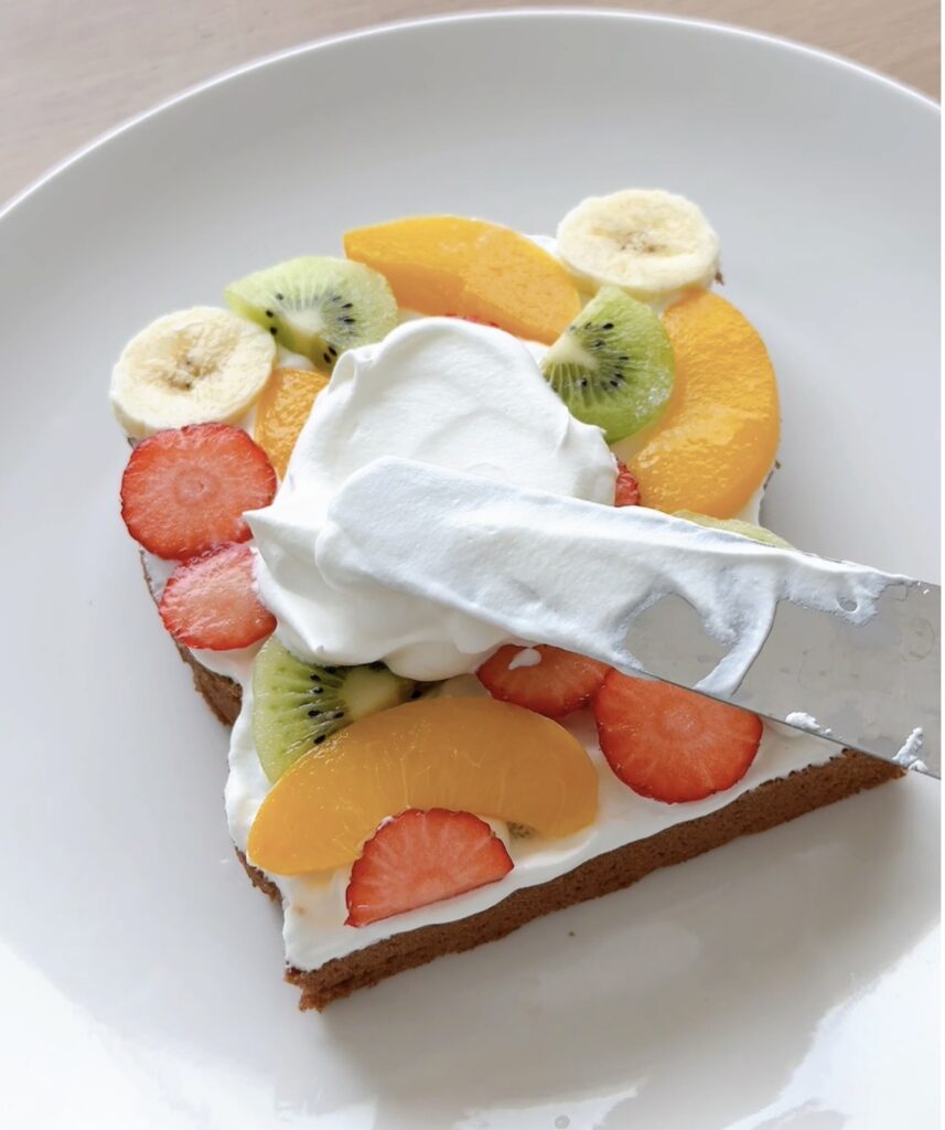 ②スポンジにシロップ、生クリームを塗り、カットしたフルーツをのせる。